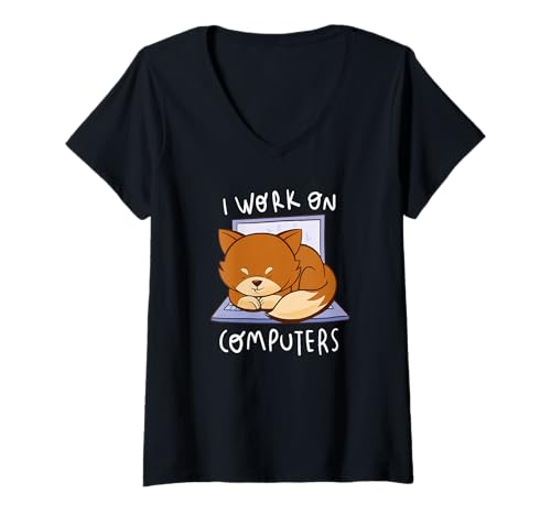 Womens I Work On Computers Funny Cat Lover Kitty Laying Down 2025 V-Neck T-Shirt