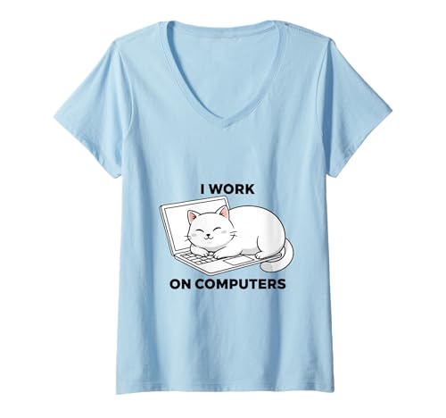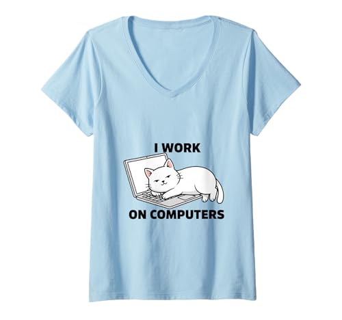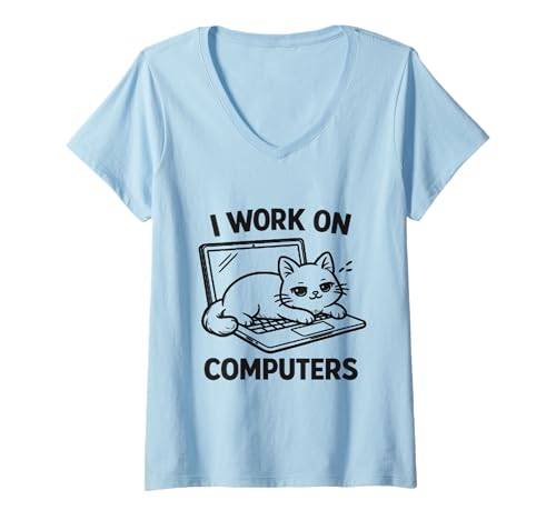 Women's Funny I Work On Computers Cat Shirt Funny Computer Cat V-Neck T-Shirt