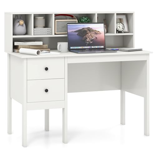 COSTWAY Computer Desk, 120 CM Wooden Study Table Writing Workstation with Hutch, Storage Shelves and Drawers, PC Laptop Table Working Desk for Home Office Bedroom (Natural)