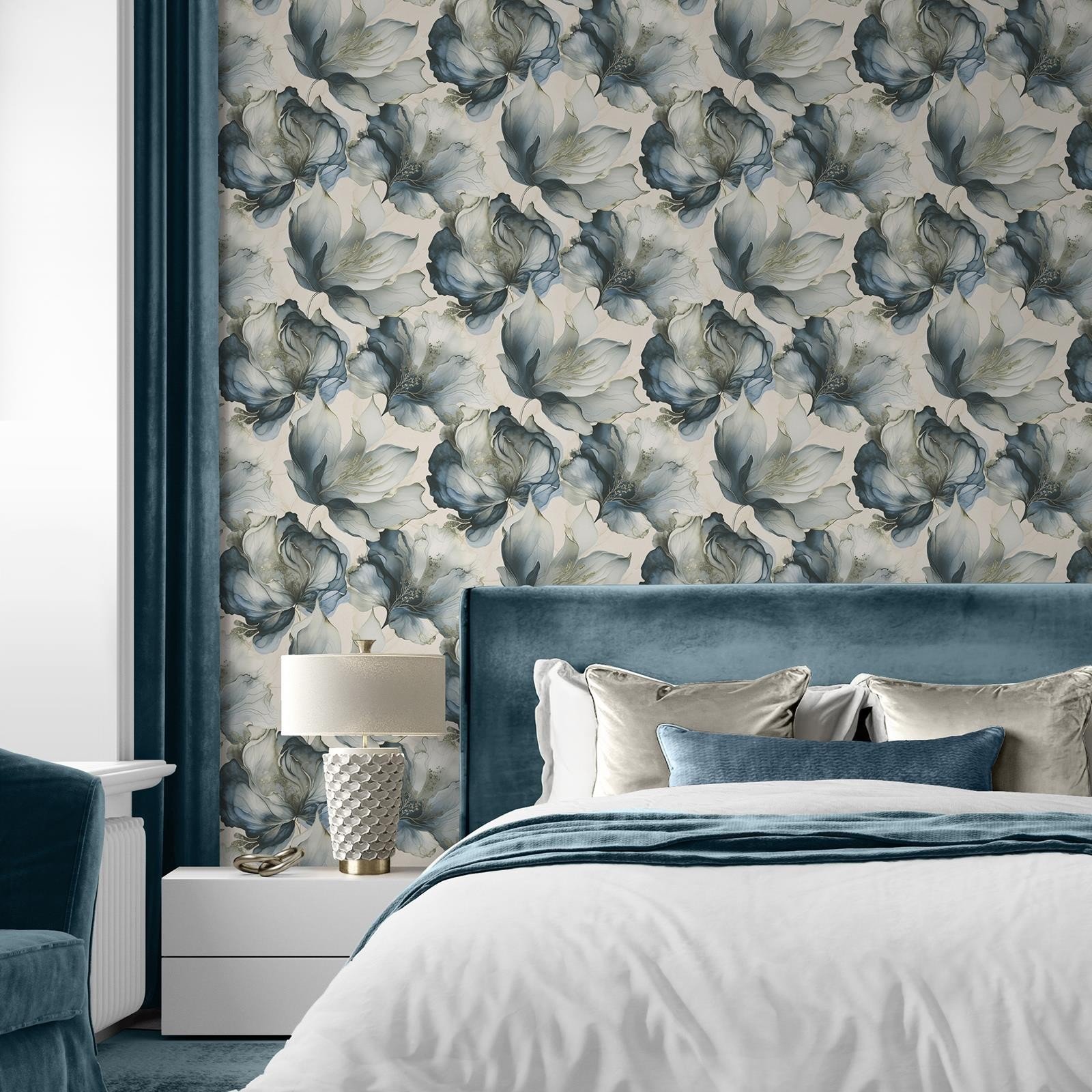 World of Wallpaper Floral Elysian Blue Grey Cream Gold Flowers AF0033