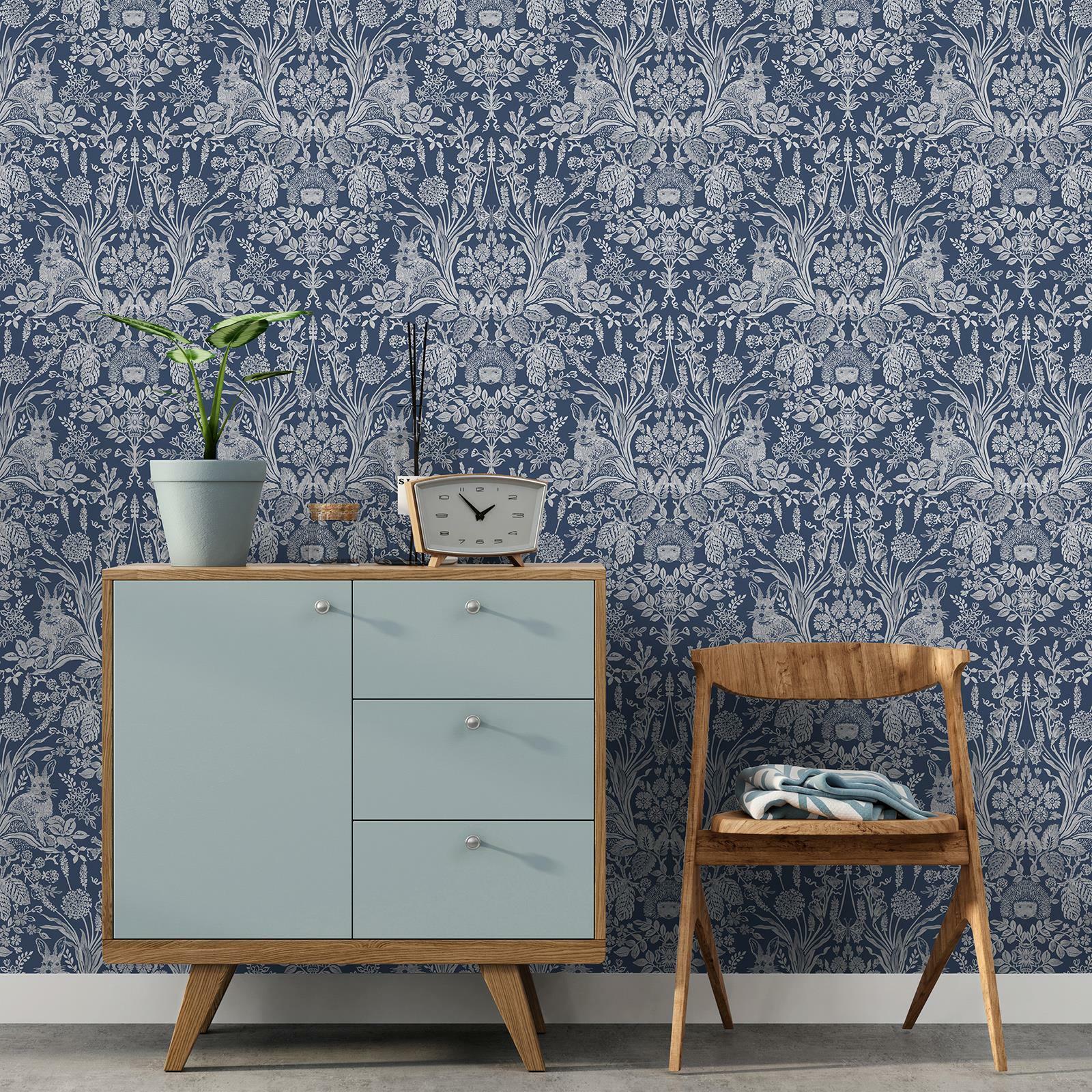 Harlen Woodland Damask World of Wallpaper Navy WOW046 Animals Floral Trails