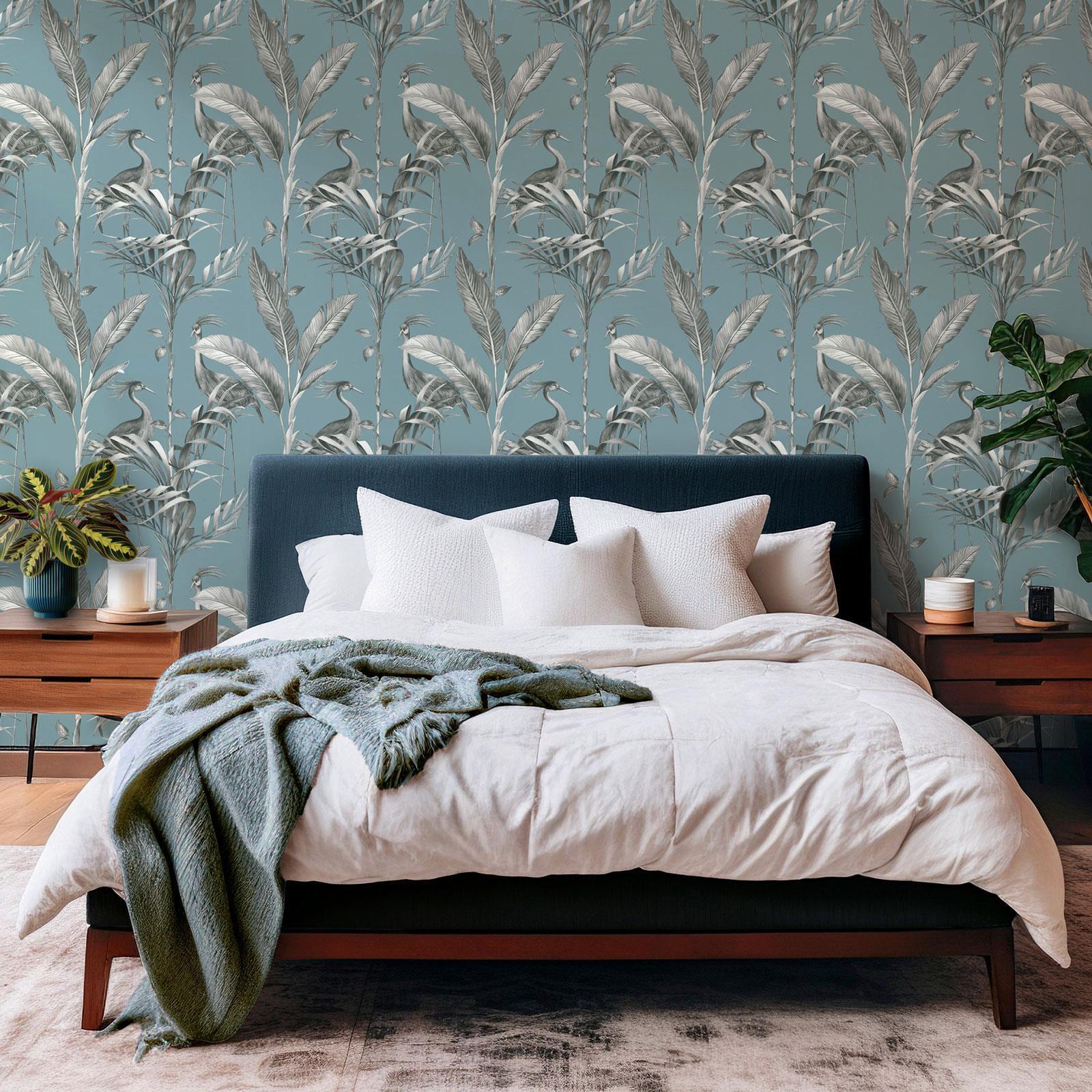 Exotic Azzurra Leaf Wallpaper Heron Birds Foliage Blue 9513 World of Wallpaper