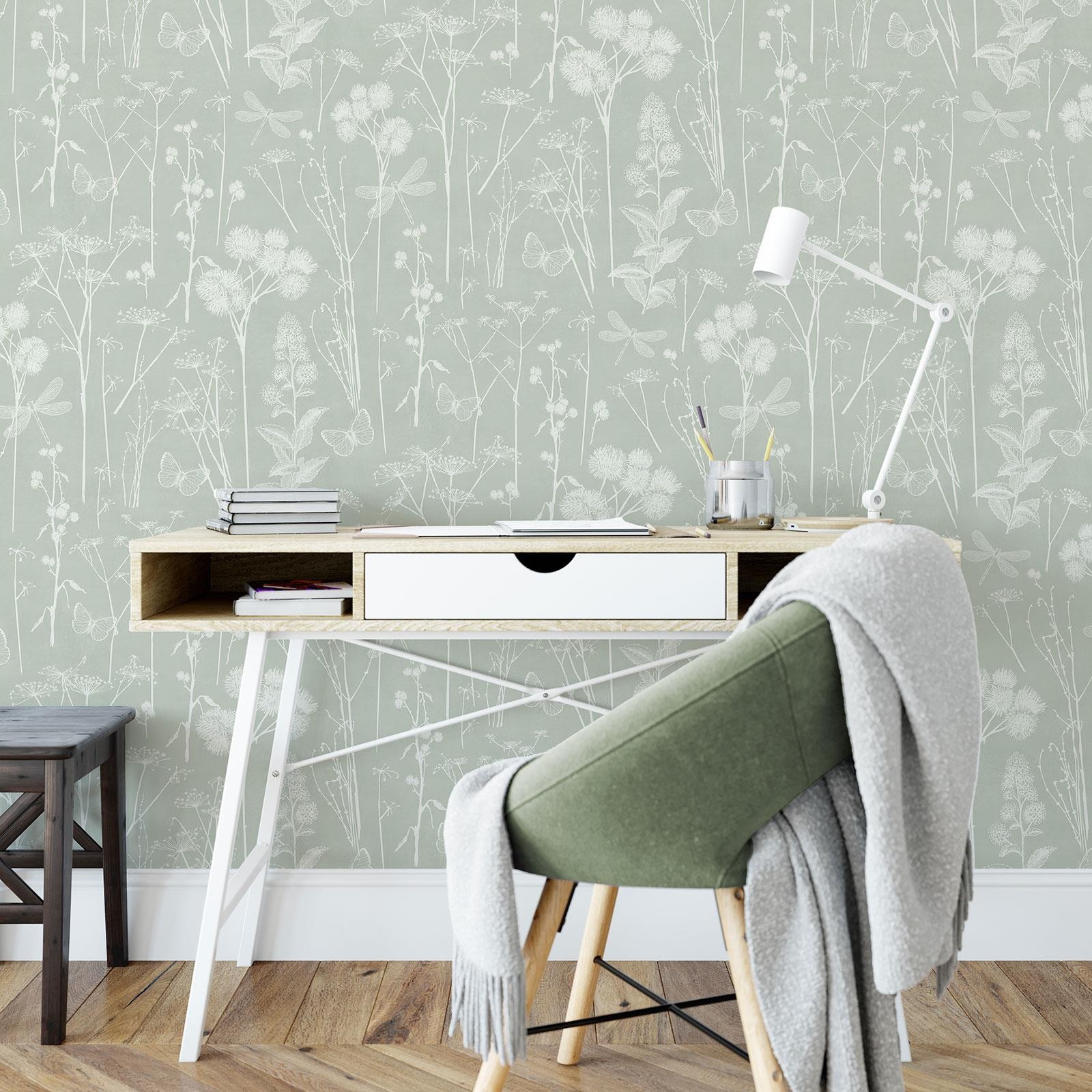 Botanical Floral Wallpaper Sage Green Butterflies World of Wallpaper AF0039