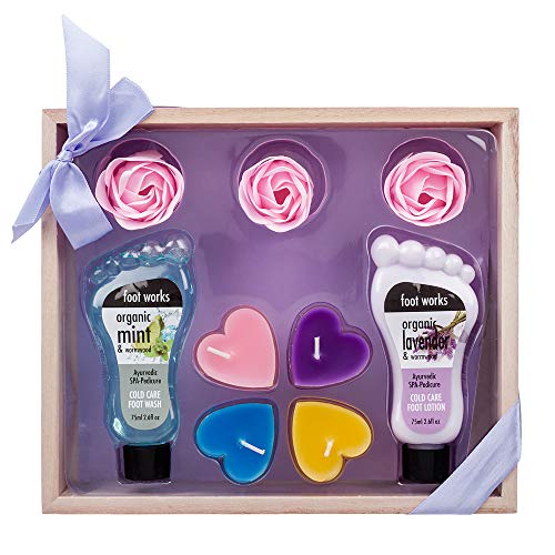 9 Piece Attractive Organic Mint & Wormwood Ladies Foot Wooden Gift Set Box - Includes Foot Lotion, Wash, Soap Flowers and Candles