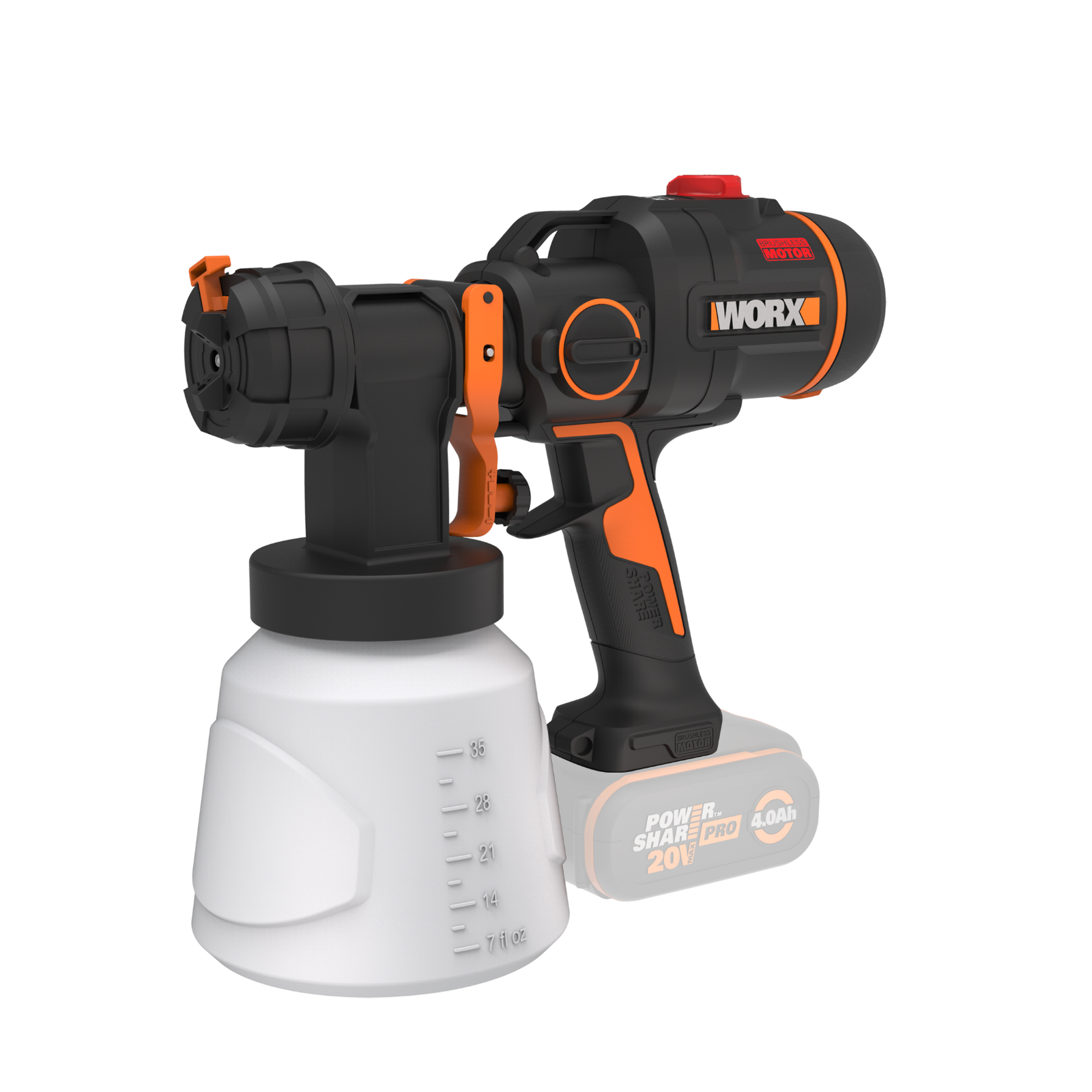 WORX NITRO Cordless Paint Sprayer WX020 - Brushless 20V Spray Gun,1L Container, 20Kpa, HVLP, 3 Spray Patterns & 4 Nozzles, for Furniture, Fence/Deck & Cabinet Painting, 4.0Ah Battery, 2A Charger