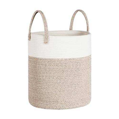 Tesmien Laundry Basket, Toy Storage Basket for Kids Baby, Large Foldable Woven Storage Baskets Cotton Rope Blanket Baskets with Handle,Organiser Nursery Decor Laundry Hamper, Khaki+White (35x40cm)