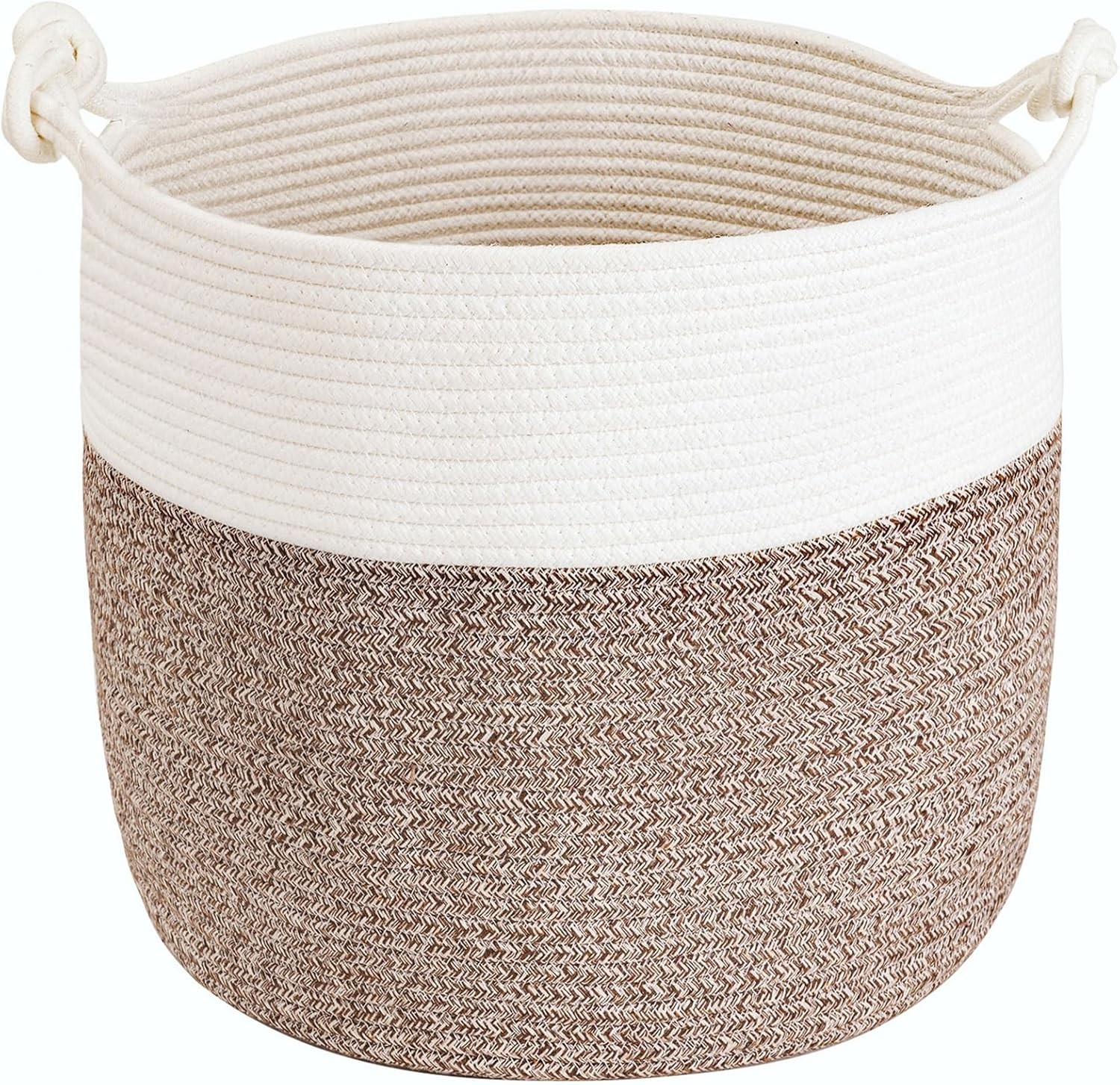 La Jolíe Muse Large Storage Basket - Cotton Rope Laundry Basket with Handle for Diaper Blanket Toy Towel Woven Laundry Basket Home Decor, White & Desert