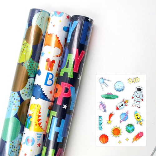 Wolepaz Wrapping Paper Rolls, 3 Rolls 43cm x 3M Gift Wrapping Paper, Dinosaur Birthday Wrapping Paper Rolls, 3 Different Printed Designs, Suitable for Birthdays, Parties, Weddings, Baby Showers