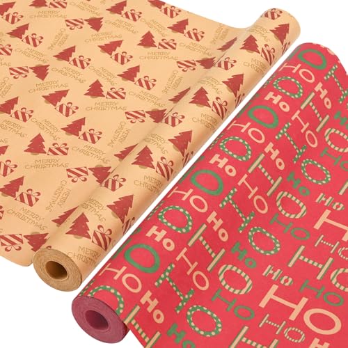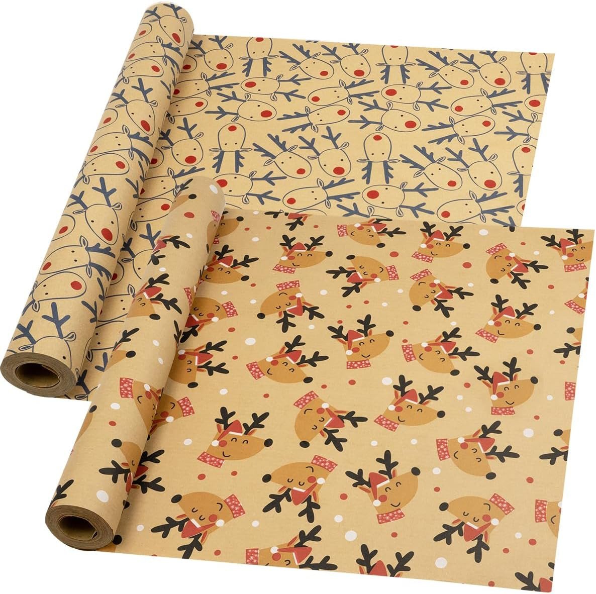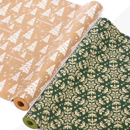 AhfuLife 2 Rolls Christmas Wrapping Paper for Gift, 43cm x 15M Xmas Wrapping Paper Rolls Recyclable Kraft Paper for Christmas Boxes Wrap Birthday Festival Party Decorations