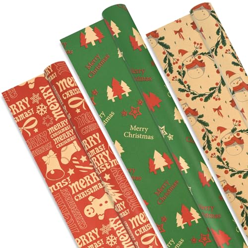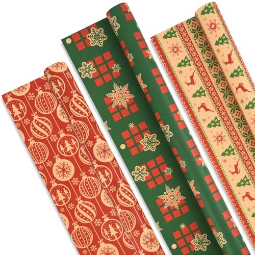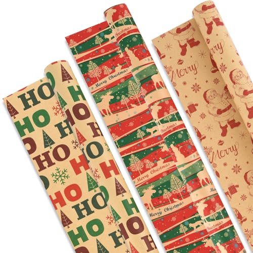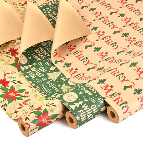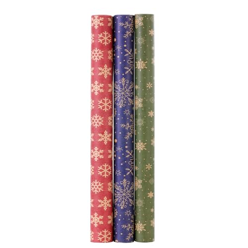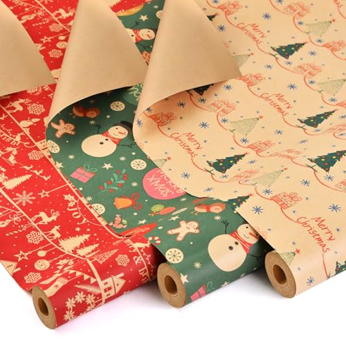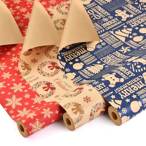 AhfuLife 3 Rolls Christmas Wrapping Paper for Gift, 43cm x 10M Xmas Wrapping Paper Rolls Recyclable Kraft Paper for Christmas Boxes Gift Wrap Birthday Festival Present Decorations