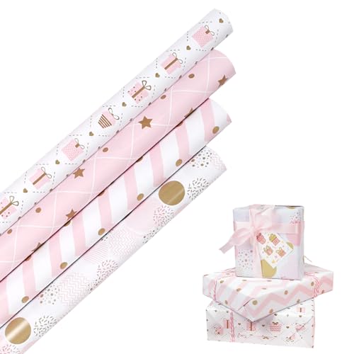 HBell Pink Wrapping Paper Rolls, 4 Rolls Birthday Gift Wrap Paper, Girls Gift Wrap 43cm x 3M for Mother's Day, Easter, Baby Shower, Party, Festive Decorations