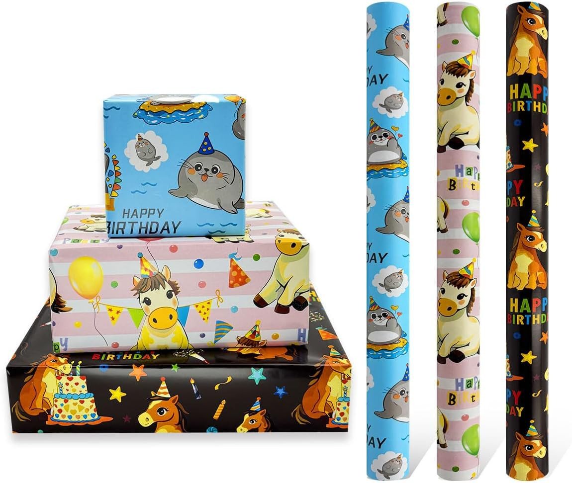 Birthday Gift Wrapping Paper Rolls, 3 Rolls 43Cm X 3M Animal Recyclable Gift Wra