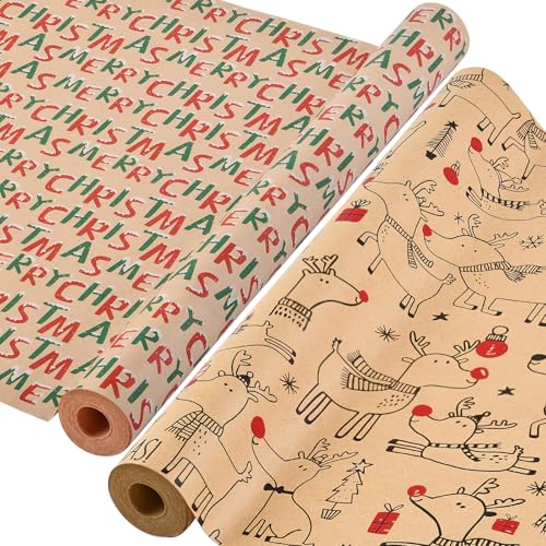 AhfuLife 2 Rolls Christmas Wrapping Paper, 43cm x 15M Xmas Wrapping Recyclable Kraft Paper Rolls for Xmas Boxes Wrap Gift Birthday Festival Party Decorations (Elk & Merry Christmas)