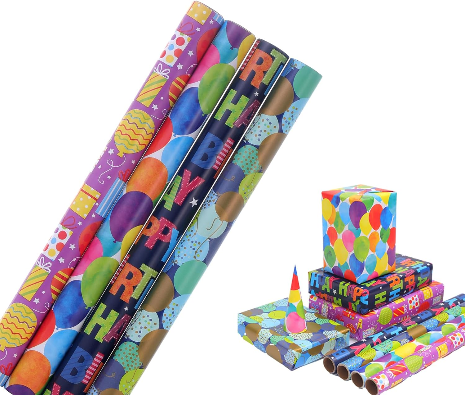 Birthday Wrapping Paper Rolls, 4 Rolls Happy Birthday Wrapping Paper, Colourful