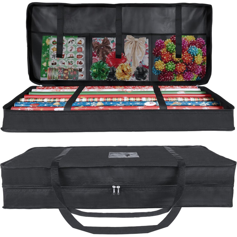 Christmas Wrapping Paper Storage Box (41.3"x14.2"x6.3", Black) with Pockets for Xmas Accessories â Compatible with Standard Rolls