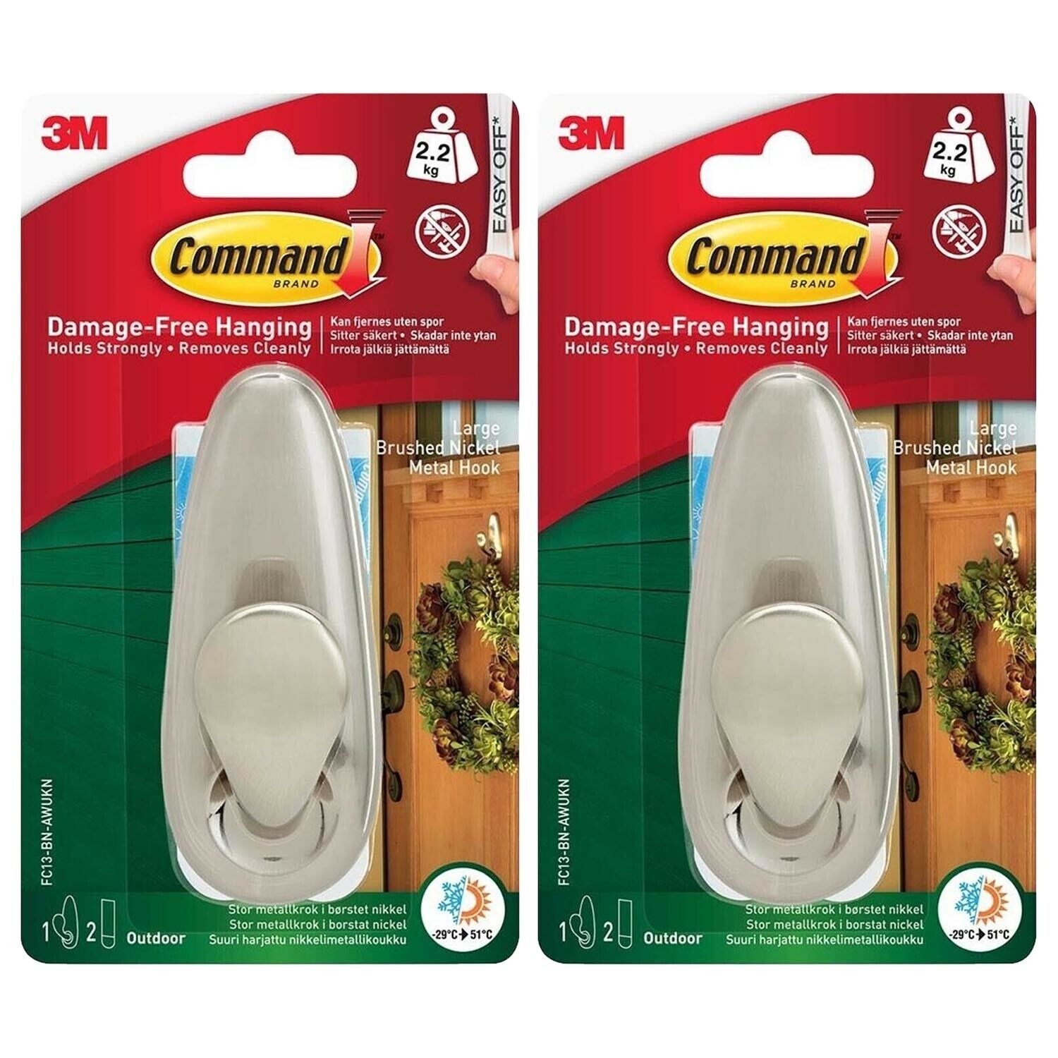 2 x Command Outdoor Large Brushed Nickel Metal Wall Hook Wreath Hook 2.2KG Max