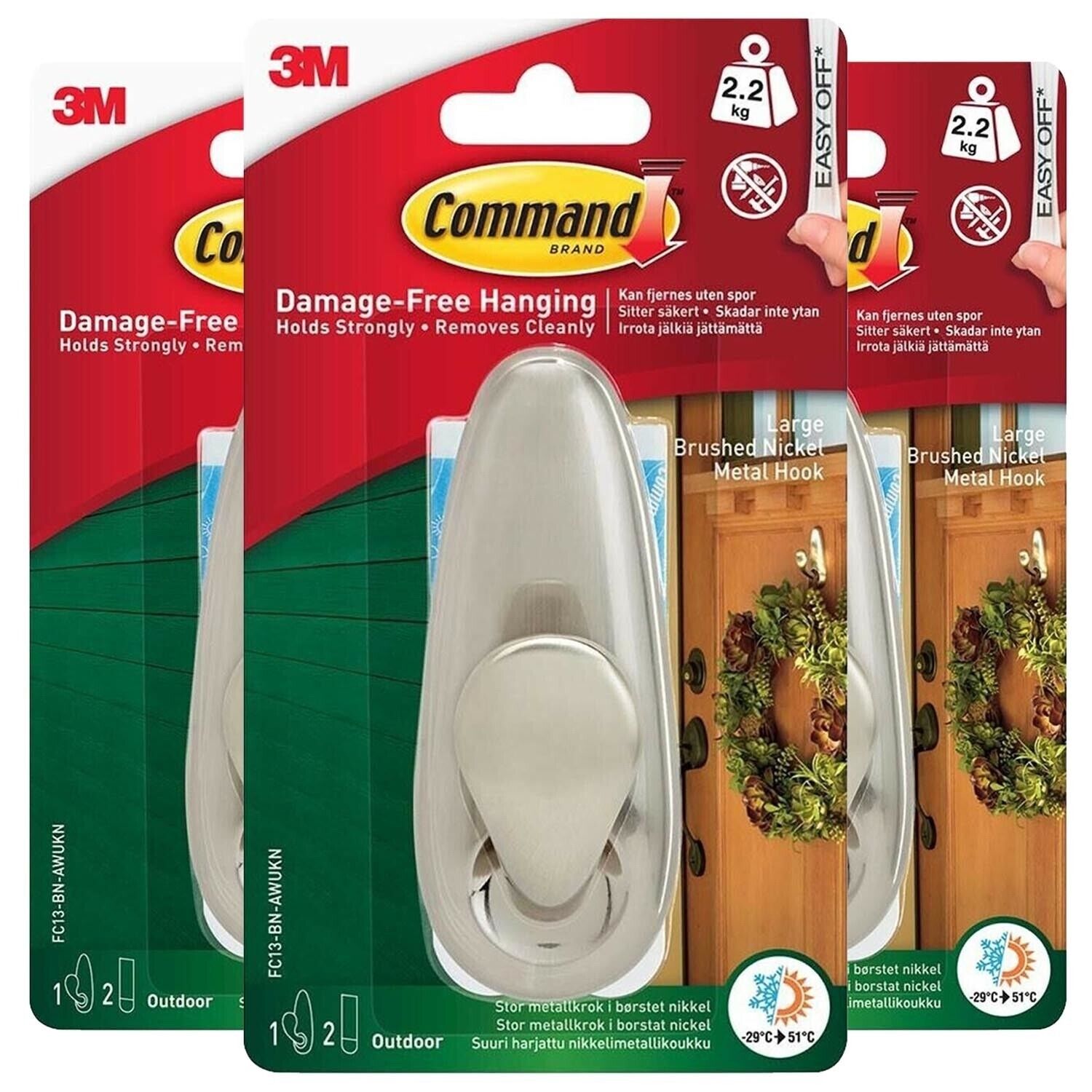 3 x Command Large Brushed Nickel Metal Wall Wreath Hook Damage Free 2.2KG Max