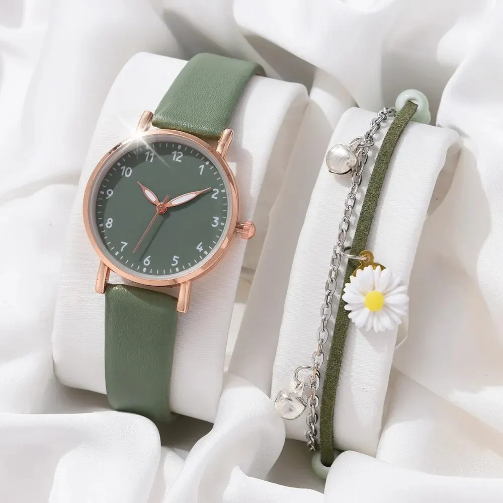 Women Quartz Watch Round Alloy Case Leather Band Bracelet Clasp Dress Wristwatch