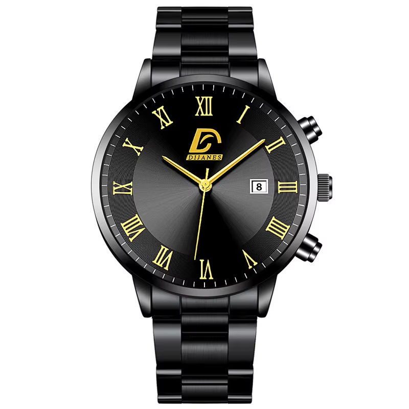 Mens Gold Quartz Wristwatch Stainless Steel Band Luxury Minimalist Calendar 41mm