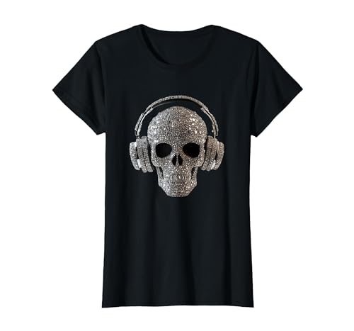 Bling Skull with Headphones - DJ Music Lover T-Shirt, Women, Black, X-Large