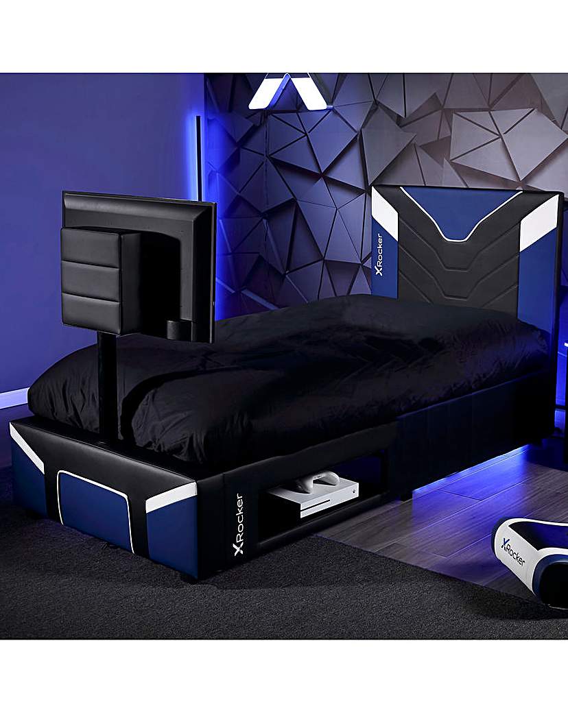 X-Rocker Cerberus Twist Gaming Bed with Rotating TV Mount, Storage Cable Management, Single 3ft Low Sleeper Bedstead, Faux Leather Upholstery, 32" TV Supported, 90x190cm Mattress Included - BLUE