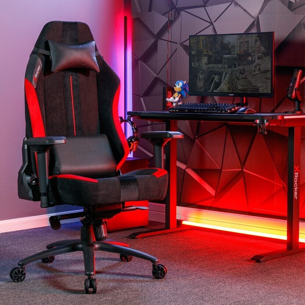X-Rocker Onyx Gaming Chair, Ergonomic Fabric PC Gamer Chair, Adjustable for Home Office, Lumbar and Head Support Cushions, Velvet & Faux Leather, Swivel High Back Recliner - RED