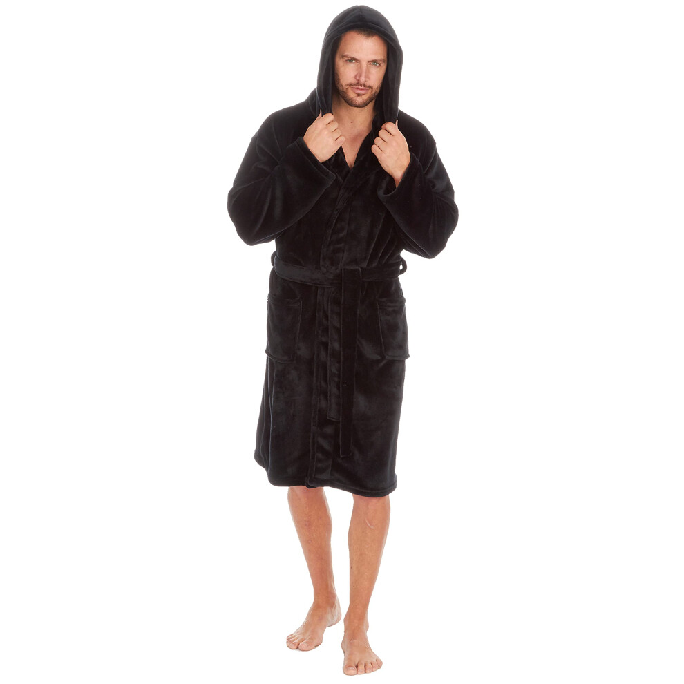 (Black, X-Large) Mens Dressing Gown With Hood Luxury Bathrobe Plush Fleece Nightwear Knee Length Short Size M L Xl Xxl Medium Large X-Large Xx-Large