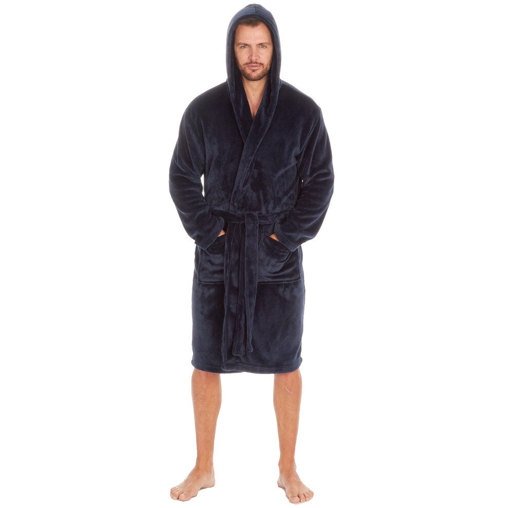 (Blue, X-Large) Mens Dressing Gown With Hood Luxury Bathrobe Plush Fleece Nightwear Knee Length Short Size M L Xl Xxl Medium Large X-Large Xx-Large