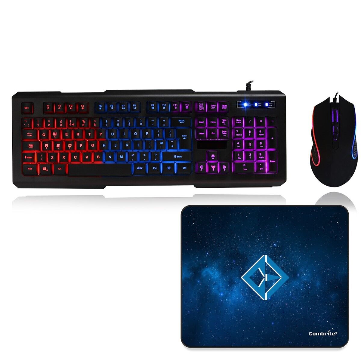 Combrite Raptor Gaming Keyboard And Mouse Set With Large Mouse Pad, Rainbow LED, USB Wired Desktop Combo, UK Layout, For Desktop PC, Laptop, PS4, PS5, Xbox One, Black (Black)
