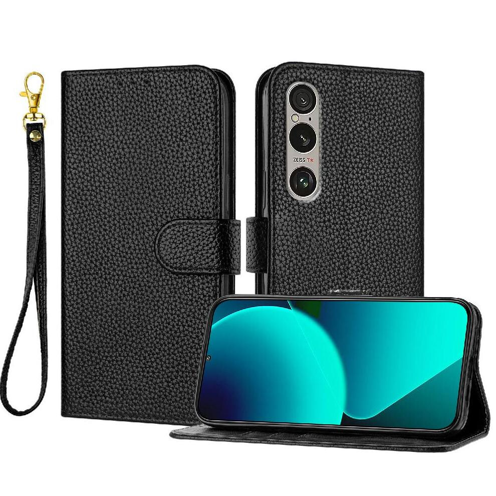 (Black) Phone Case for Sony Xperia 1 Vi 2024 Pu Lether Litchi Pattern Flip Folio Card Slots Holder Wallet