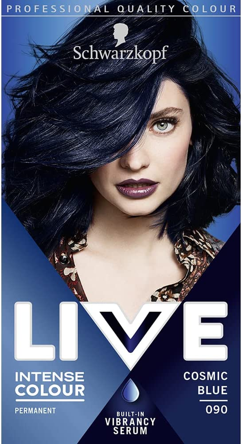 Schwarzkopf LIVE Intense Colour, Long Lasting Permanent Black Blue Hair Dye, With Built-In Vibrancy Serum, Up To 100% Grey Coverage, Cosmic Blue 090
