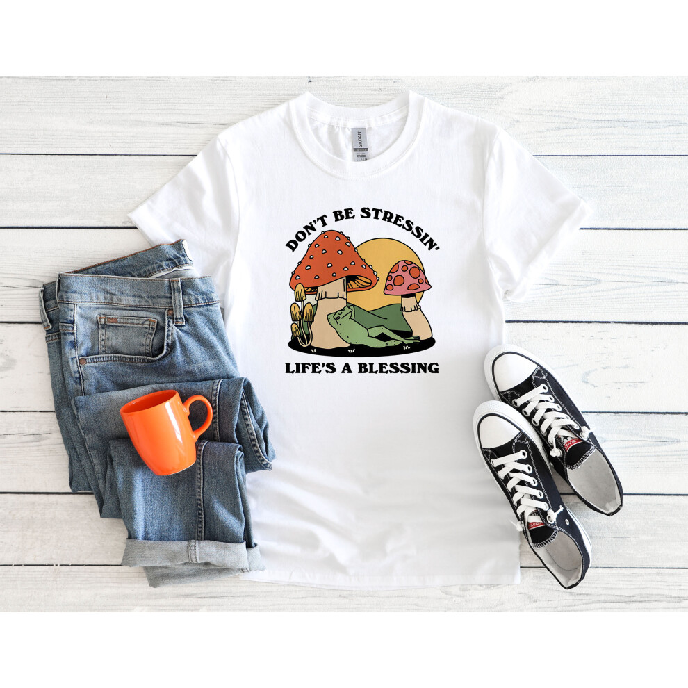 (XXXXL, White) Don't Be Stressin Lifes a Blessing Psychedelic Mushroom Concert Men Women Unisex Top T Shirt