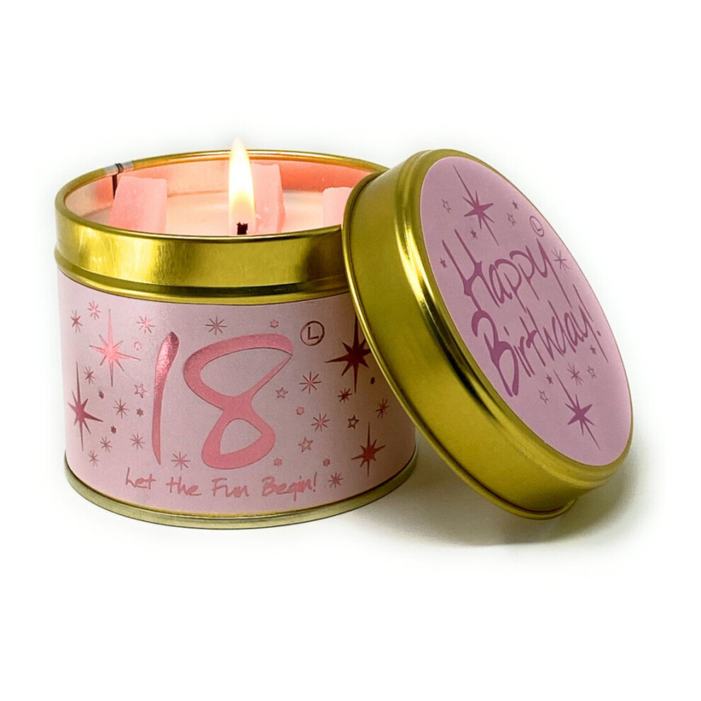 Lily Flame LF-Birth-18 Happy Birthday 18 Tin Candle - Cruelty Free & Vegan, 35h Burn, Powdery Rose Peach Mango Scent