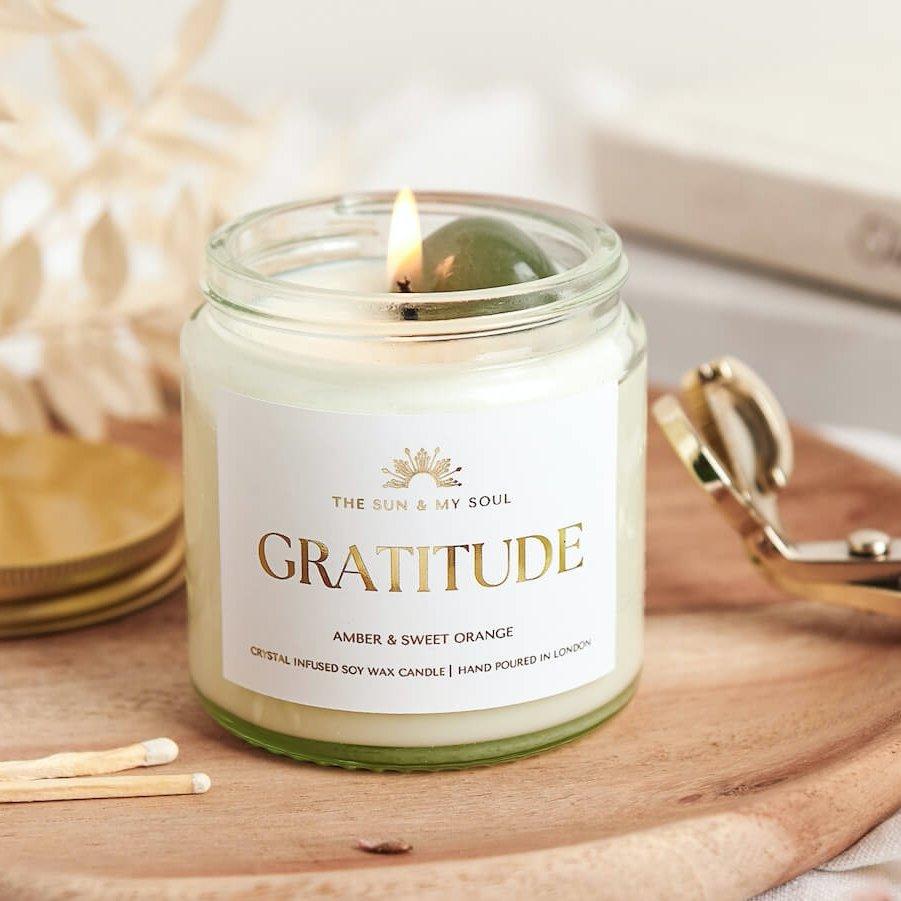 Gratitude Crystal Candle with Green Aventurine Crystal, Scent Amber, Sweet Orange, Premium Soy Wax
