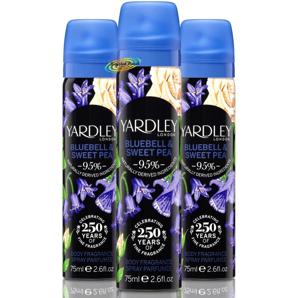 3x Yardley London BLUEBELL & SWEET PEA Body Spray 75ml