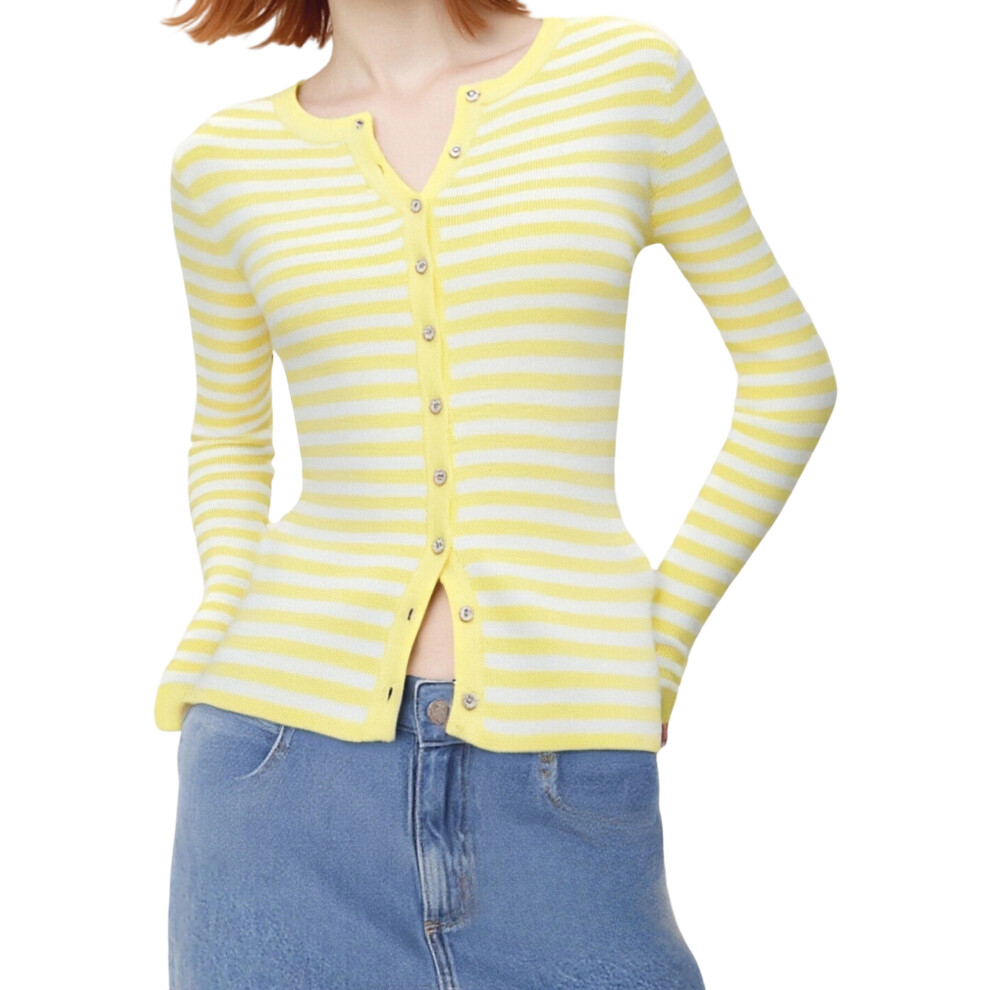 (M, Yellow) Women Striped Cardigan Slim Fit Crew Neck Long Sleeve Button-up Knit Sweater Casual Fall Streetwear