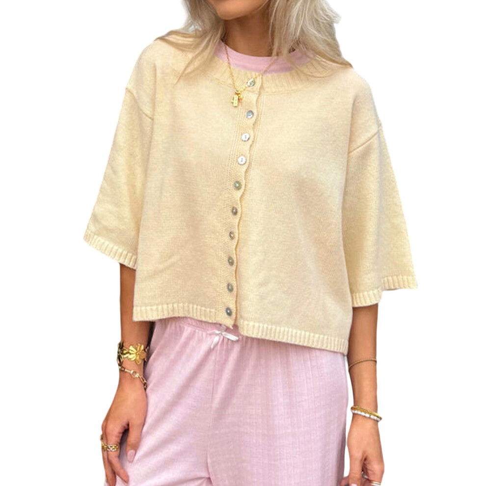 Sweet Bunny Polo Collar Short-sleeved Sweater Women's Summer Loose Contrast Yellow Women Knitted Cardigan Crop Top