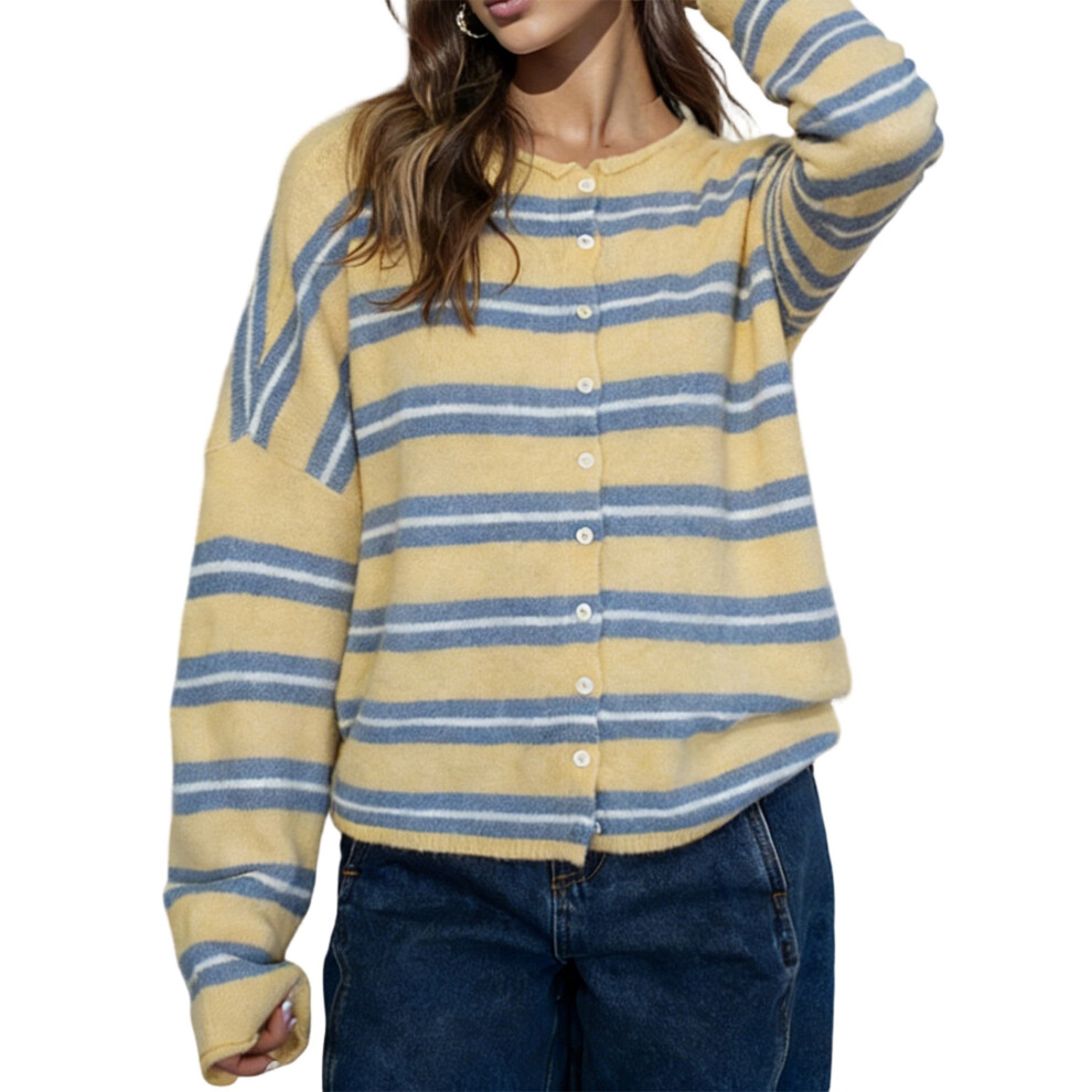(L, Yellow) Women Striped Cardigan Slim Fit Crew Neck Long Sleeve Button-up Knit Sweater Casual Fall Streetwear