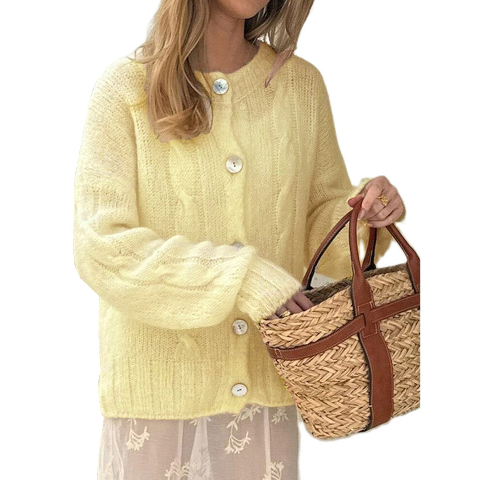 (L, Light yellow) Women Fuzzy Cardigan Solid Crew Neck Long Sleeve Button-up Knit Sweater Casual Fall Clothes
