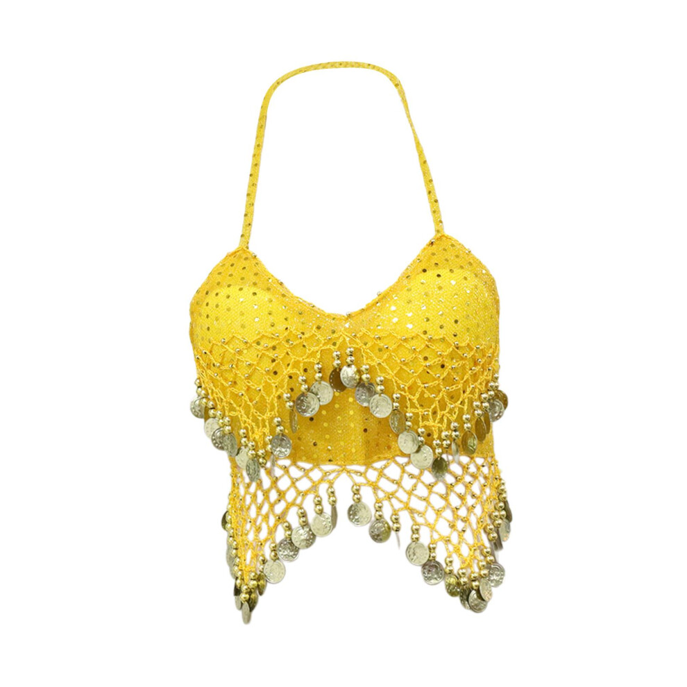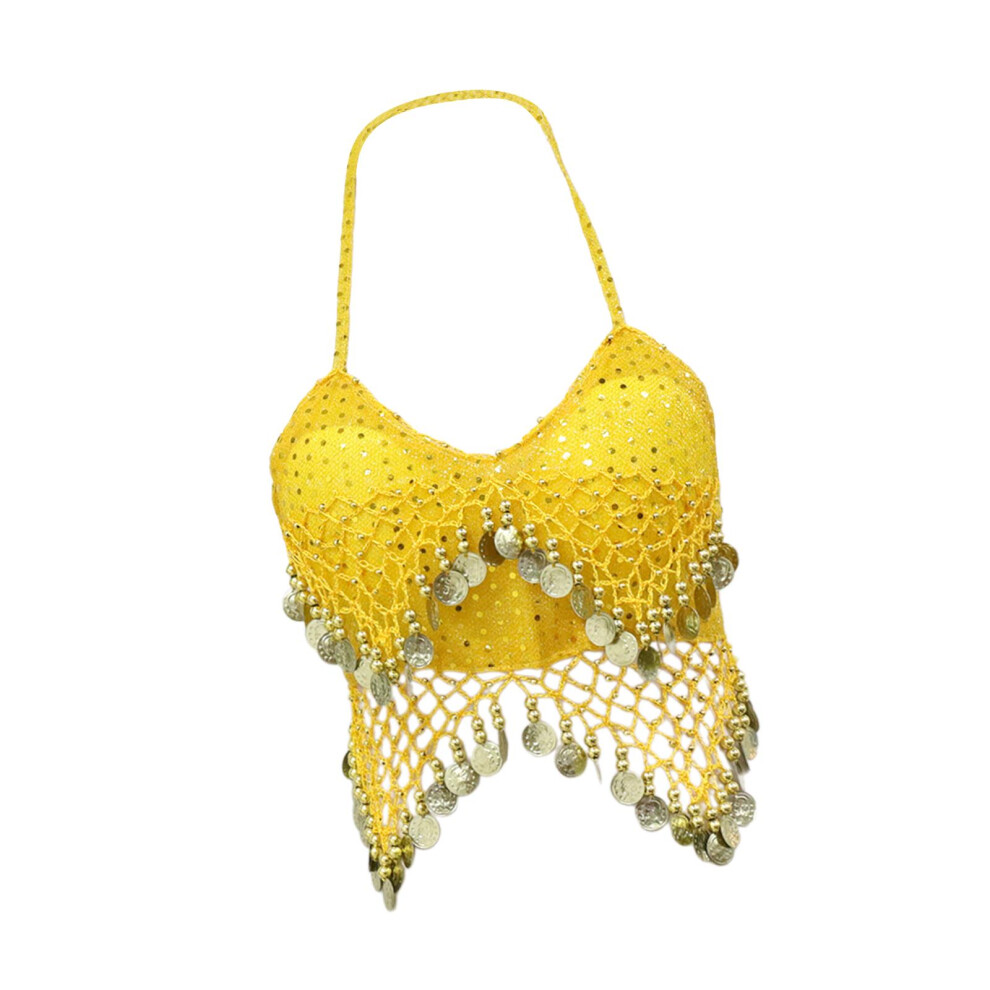 (Yellow, Length 30cm) Crop Top Is Lightweight Halter Lace Up Exotic Dance Top Sequin Crop