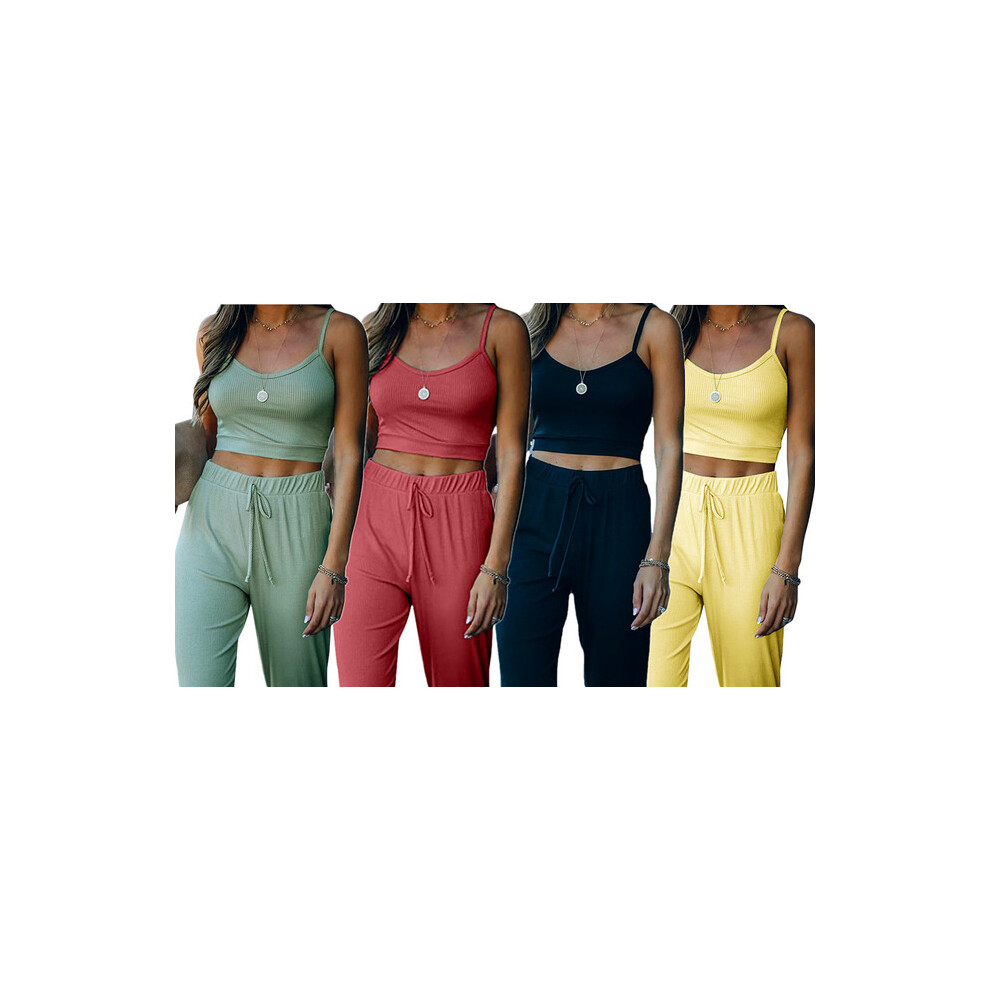 (S, Yellow) Strappy Crop Top Joggers Pants 2 Pcs Set