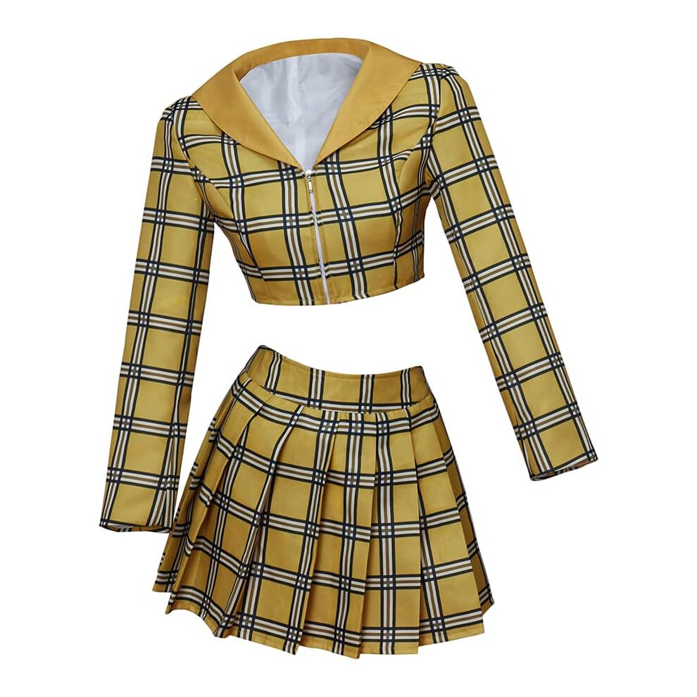 Clueless Cher Cosplay Costume Dress Yellow Plaid Crop Top Skirt Suit Halloween Outfit for Women Girls (XL, yellow)