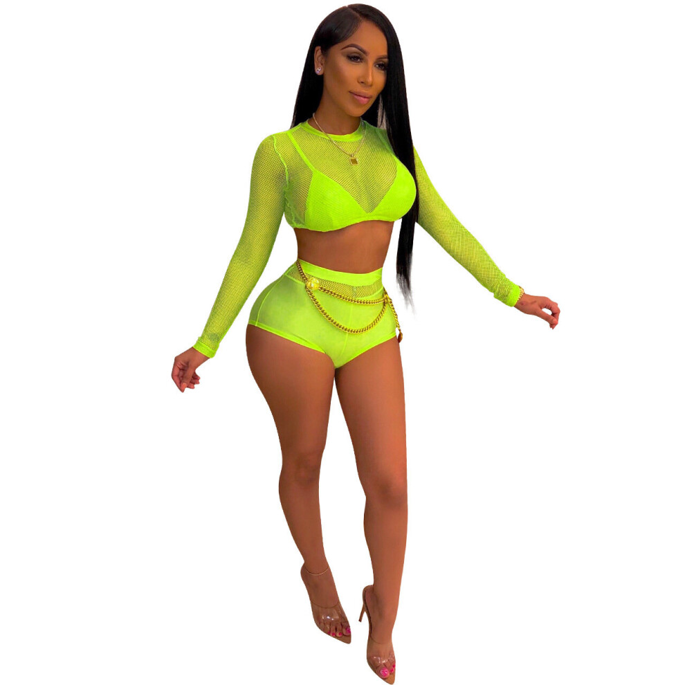 Summer Women Sexy Mesh Two Piece Set Neon Yellow Crop Top Shorts Ladies Perspective Night Club Party Suit See Through Streetwear