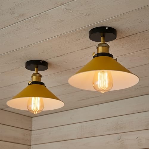 Pack of 2 Vintage E27 Flush Fitting Ceiling Lamp with 22cm Yellow Conical Lampshade Easy to Fit Durable Metal Ceiling Lighting Fixtures for Bedroom, Kitchen, Livingroom with EPC A+ Bulb