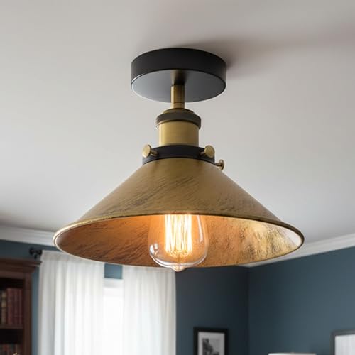 LEDSone Semi Flush Ceiling Light E27 Fittings 22cm Yellow Brass Conical LampShade Easy to Fit Durable Metal Vintage Ceiling Lighting Fixture for Living Room, Bedroom, Kitchen with EPC A+ Bulb