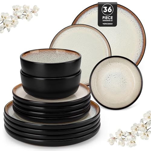 vancasso Amber 36 Pieces Dinner Set for 12, Reactive Glaze Stoneware Plates and Bowls Set, Yellow Crockery Set with Dinner Plates, Dessert Plates & Cereal Bowls, Microwave & Dishwasher Safe