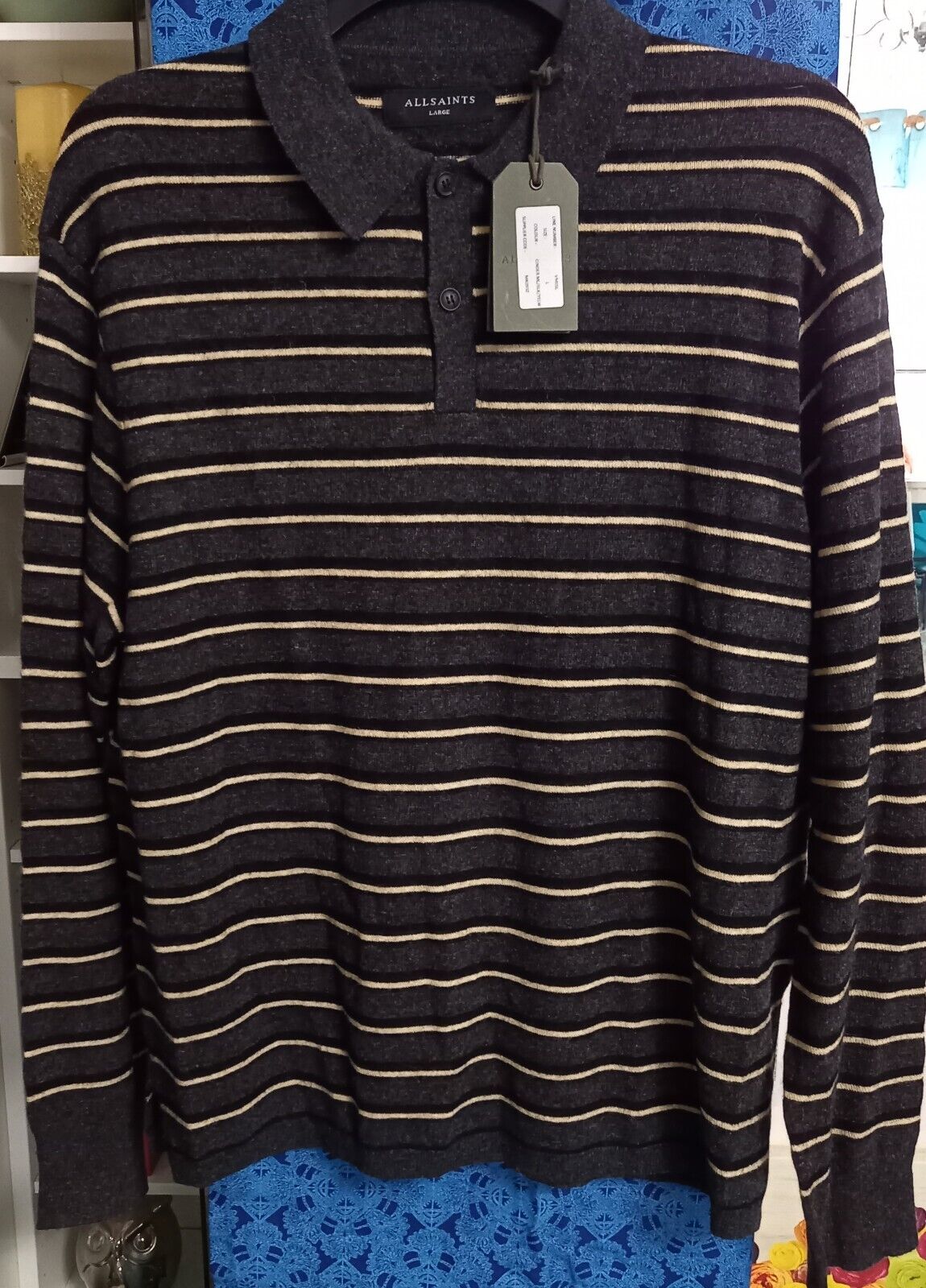 AllSaints Stafford Long Sleeve Knitted Polo Grey/Black/Yellow Shirt, Men's L