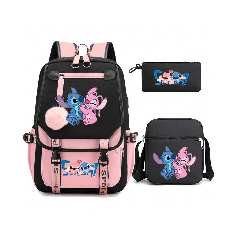 (Yellow) Loli Stitch Backpacks USB 3PCS Large Shoulder Bag Travel Backpack Patchwork Laptop Student School Bags Bagpack Mochila