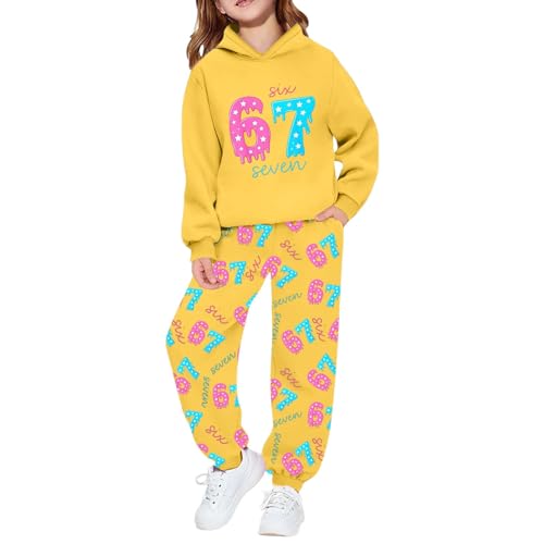 Girls Fashion Casual Two Piece Outfit Soft Hooded Top and Pants Set with Print Design for Youth Big Kids Comfort Fit Yellow Womens Tracksuit Outfits Age 11-12