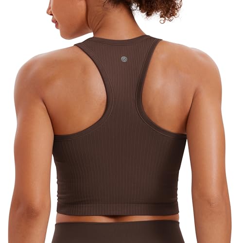 CRZ YOGA Women's Longline Ribbed Crop Tank Top Padded Wireless Racer Back Sports Bra Yoga Vest Tops with Built in Bra Hot Fudge Brown 10